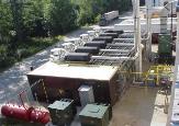 | 6 - New Units Canceled Project Cooper Superior Model 2406 Natural Gas Powered Generators 900 kW each 60 Hertz CONTINUOUS Total 5.4 MW PLUS: 883 kW Mitsubishi Diesel Prime Power Emergency Back-Up Generator Gas Compressor This generating plant includes a 5.4 MW islanded generating system powered by six natural gas-fueled, lean-burn, spark-ignited, Cooper Superior Model 2406 reciprocating engines operating at 1200 RPM. The plant is fully black start capable, and island or grid-parallel operating modes are possible. Modular construction is used throughout, with six modules each containing one natural gas engine, its radiator and associated auxiliaries, and a seventh module containing a 1.0 MW diesel emergency generator and the plant switchgear and oil and compressed air utilities. The modules can be removed and transported as individual units. Only natural gas, oil, and compressed air piping, and power and control wiring tie one module to another. A single ply membrane has been applied on top of the modules to provide a continuous leak-proof roof over the engine sections of the generator modules. Electrical Connections - Buss duct is used for all gas generator output powerconnections to the main switch, cable tray for all connecting control wiring. The diesel generator is connected via conventional wire and wireway. Jacket Water and Auxiliary (Oil and Turbocharger Intercooler) Cooling Jacket water and auxiliary radiators are roof mounted (horizontally) above an air plenum room below, which is pressurized by four 5 HP electric motor-driven cast propeller fan assemblies. The fans for each module are individually controlled based on return jacket water temperature by the house controller, to minimize parasitic fan energy losses. The auxiliary radiator and jacket water are in series in the airflow, with air passing from the plenum room through the auxiliary radiator first, then through the jacket water radiator above. Block Heating - Each group of three gas engines is thermally coupled by a three pass welded plate heat exchanger that allows a single running engine to maintain 160 degF jacket water temperatures in its two companion gensets. The three engines’ jacket water systems are completed isolated from one another by the plate heat exchanger. The diesel engine has a conventional thermostatically controlled electric block heater. Utilities - Makeup oil is supplied from a central location via hard piping and permanent pump to each engine’s makeup oil tank and also directly to the oil sump fill point, ahead of the oil level regulator. Spent oil from each engines’ sump and oil cooler is evacuated via permanent pump and hard piping to an outdoor waste oil tank capable of storing one complete set of oil changes for all six gas engines. Using this system, oil replenishment and changes can be accomplished quickly and without risk of spill or wasted oil. Compressed air is supplied via a 10 HP Ingersoll Rand industrial air compressor with a vertical tank. Compressed air is available for operating pneumatic engine controls and pneumatic service tools. Engine pneumatics can also be operated using the high pressure natural gas fuel supply, although this mode of operation requires that fuel gas supply pressures be maintained above 50 psig in order to achieve full generating system output. Sound Attenuation - The generation modules are fully noise attenuated with engineered acoustical materials. Exhaust noise is muffled with critical grade silencers. The system currently emits sound resulting in noise levels below 65 dBA at the property line approximately 100 ‘ away. This noise drops to almost 55 dBA when the radiator fans are not operating. Use of a variable speed drive to slow the fans rotational speed could be expected to lower overall sound levels to below 58 dBA at all times, under all load conditions. Cogeneration Equipment - Each gas generator is equipped with a welded plate jacket water heat exchanger sized for complete recovery of jacket water heat. The secondary side of these heat exchangers is not currently connected to any of the plant thermal load. |